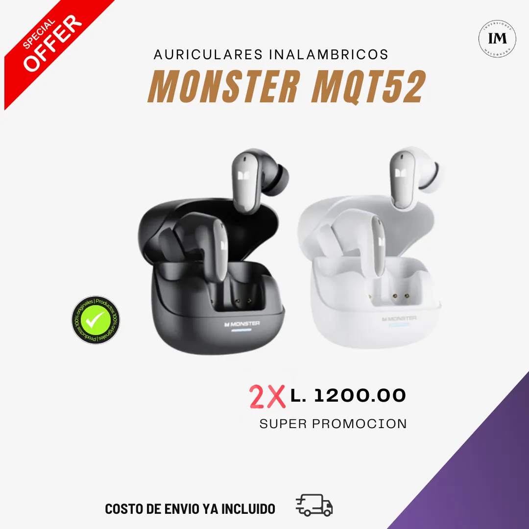 Descubre la potencia del sonido con los Monster MQT52, auriculares inalámbricos de tipo TWS equipados con Bluetooth 5.4, garantizando una conexión estable en todo momento. Con bajos profundos y detallados, ofrecen una experiencia auditiva excepcional, perfecta para música, llamadas o contenido multimedia.