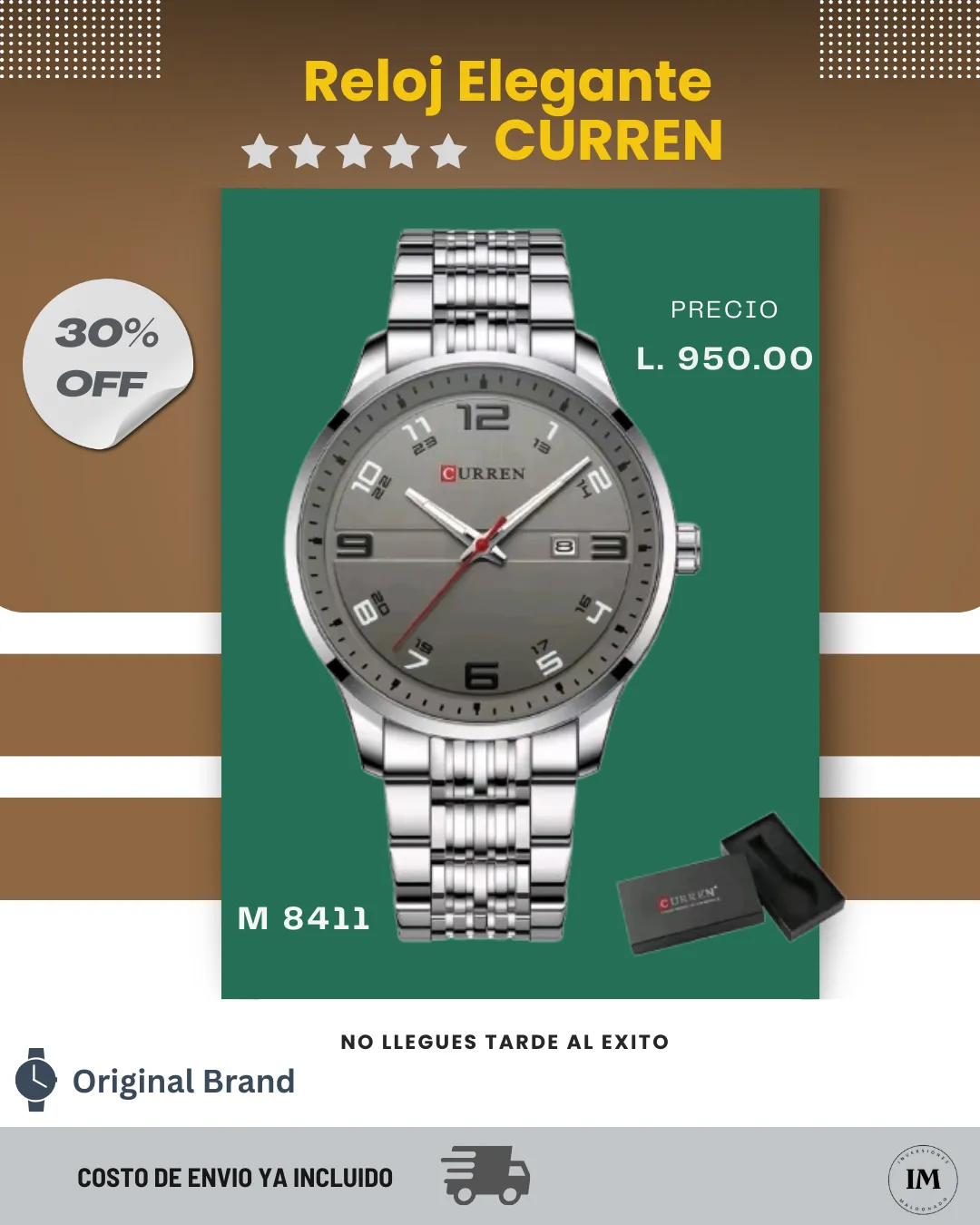 El reloj Curren 8411 destaca por su diseño refinado en acero inoxidable y acabado plateado, haciéndolo el accesorio perfecto para quienes buscan estilo y durabilidad en un solo producto. Su estética moderna aporta una sensación de lujo que eleva cualquier estilo personal.