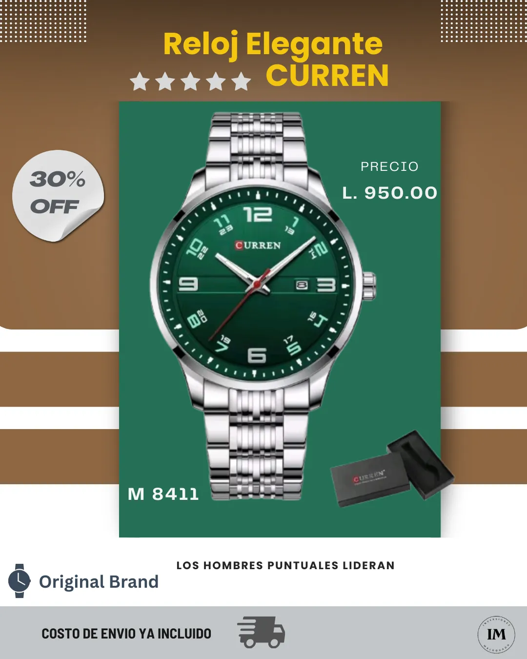 Equipado con un movimiento de cuarzo, el Curren 8411 asegura un rendimiento impecable y duradero. Su mecanismo confiable garantiza que nunca pierdas la noción del tiempo mientras disfrutas de su estilo limpio y versátil. Es una opción perfecta para quienes valoran la funcionalidad tanto como el diseño.